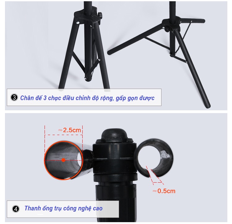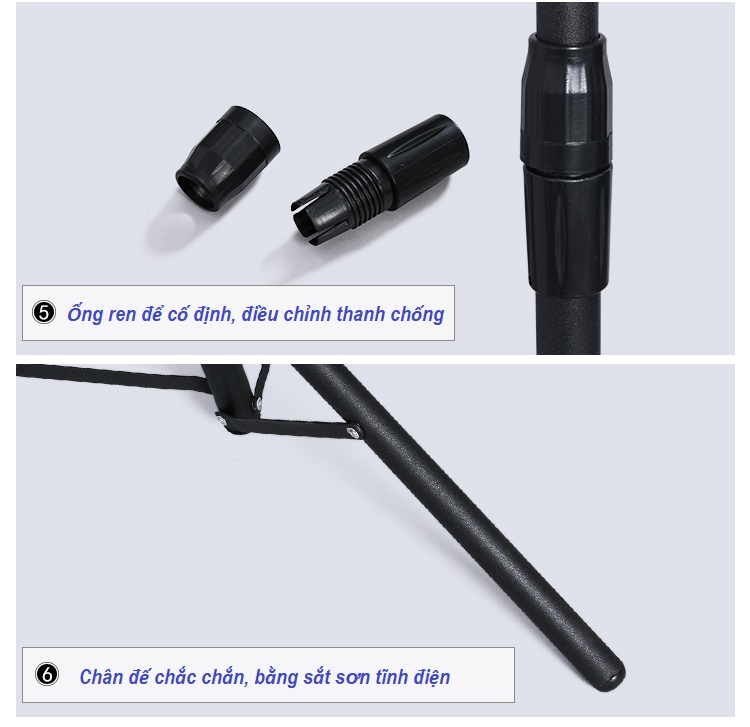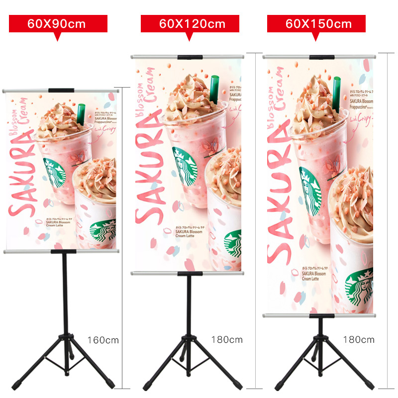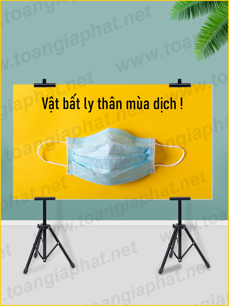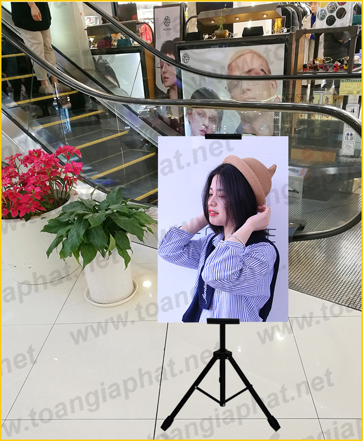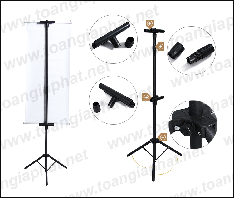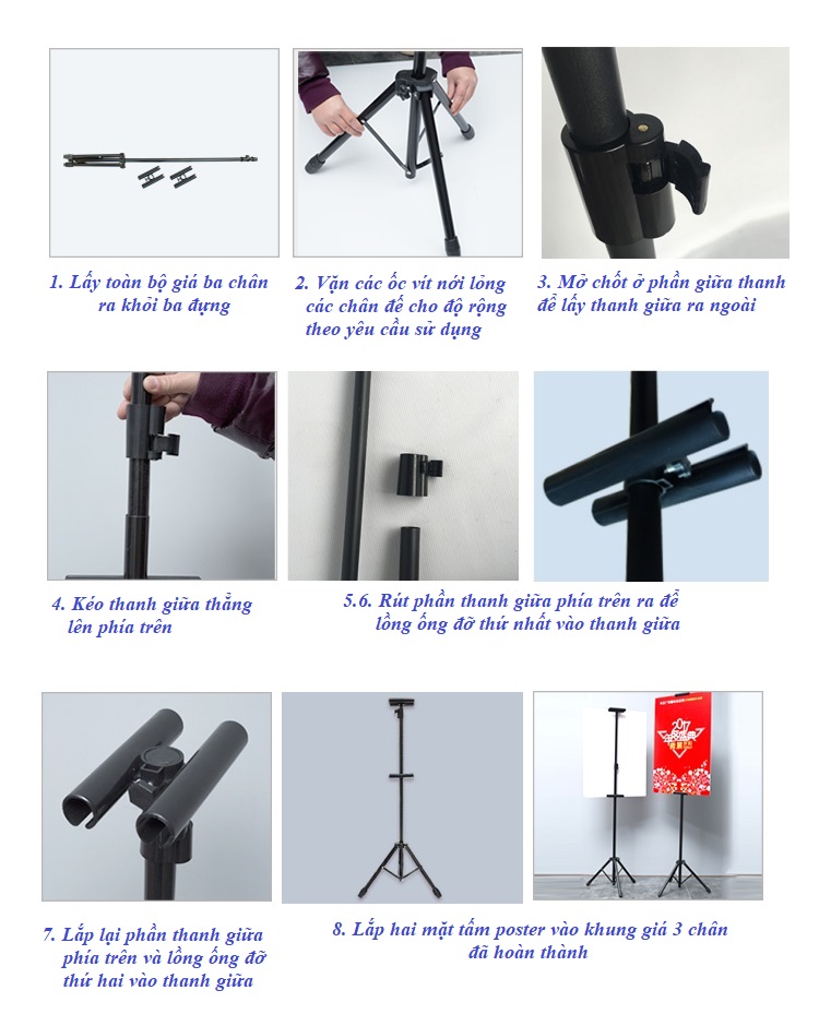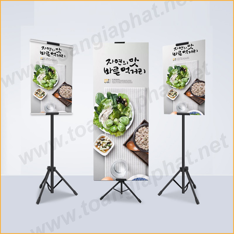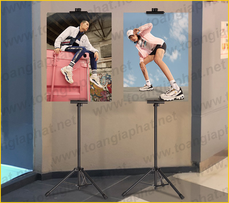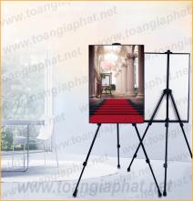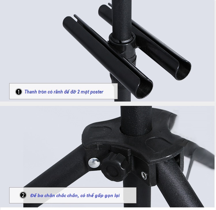 * Giá đứng 3 chân, gấp xếp được, chất liệu bằng sắt sơn tĩnh điện (2 mặt poster) ; Bao đựng bằng túi vải chuyên dụng màu đen.