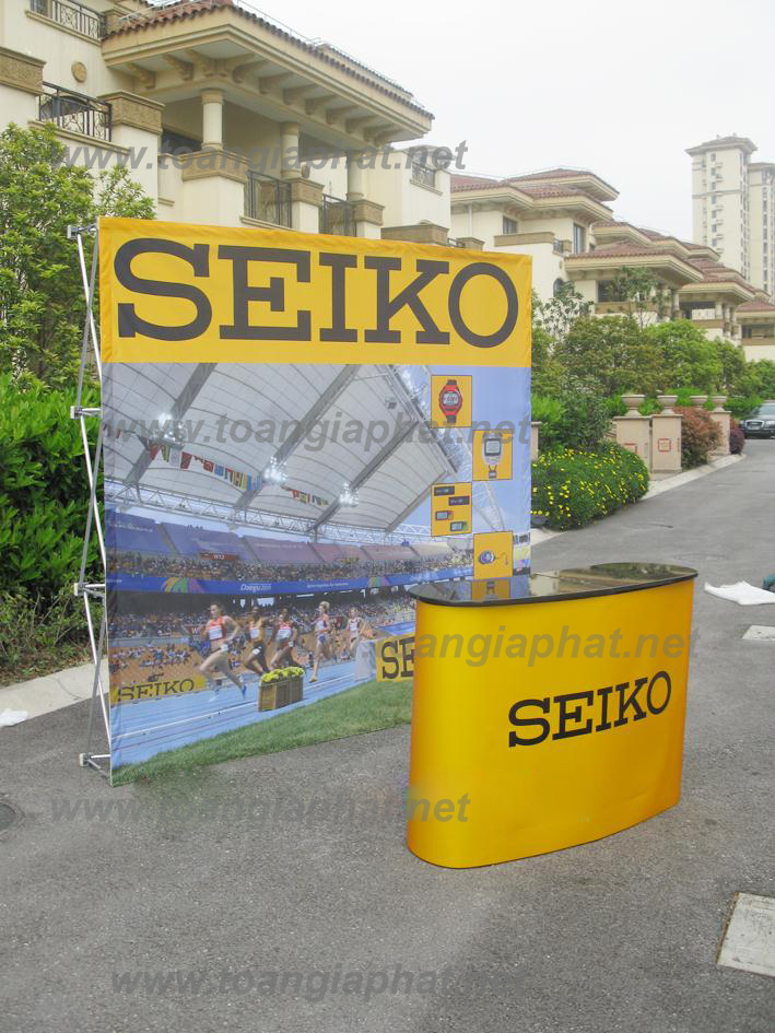 Khung Backdrop di động hay còn gọi là Pop up loại sử dụng băng dính móc có ưu điểm vượt trội là thi công lắp ráp poster rất đơn giản, có thể in liền tấm poster lớn không cần ghép từ nhiều tấm nhỏ. Có thể dùng thay đổi nhiều tấm poster trên cùng một khung pop up chỉ cần thêm cuộn dây dính móc. Đây là sản phẩm mang tính chuyên nghiệp cao có thể tái sử dụng nhiều lần, có thể gấp xếp khung pop up gọn lại để di chuyển mà không phải tháo rời tấm poster ra khỏi khung rất thuận tiện. Kiểu dáng hiện đại, sang trọng, kích thước poster lớn rất phù hợp cho các công ty thường xuyên tổ chức các sự kiện lớn như các buổi hội thảo, các buổi biểu diễn nghệ thuật, các hội chợ triển lãm..v..v… thể hiện qui mô, tầm cỡ cũng như tính chuyên nghiệp của nhà tổ chức chương trình.
